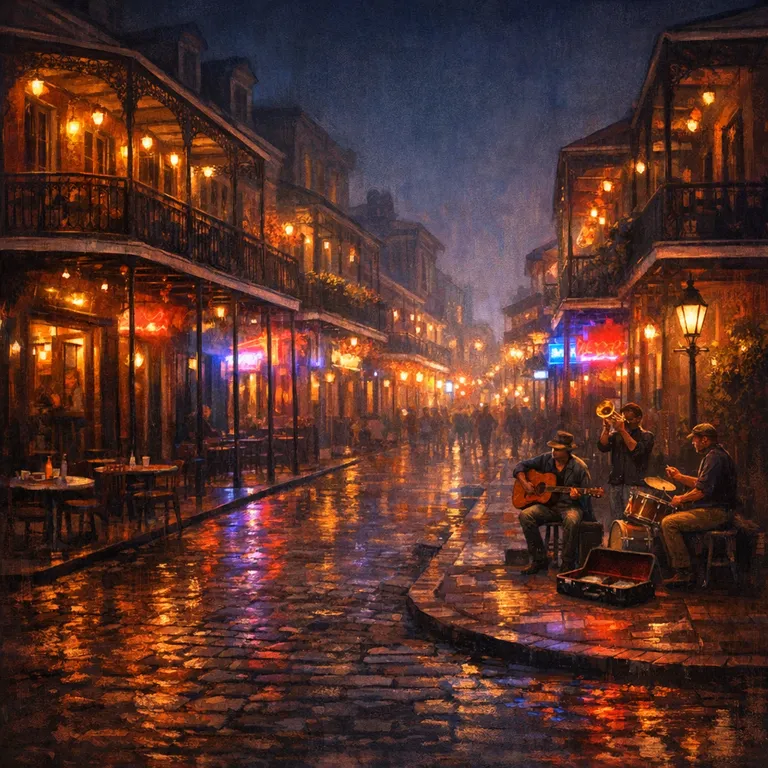 A famous street in the French Quarter, known for its lively atmosphere and numerous bars and clubs.