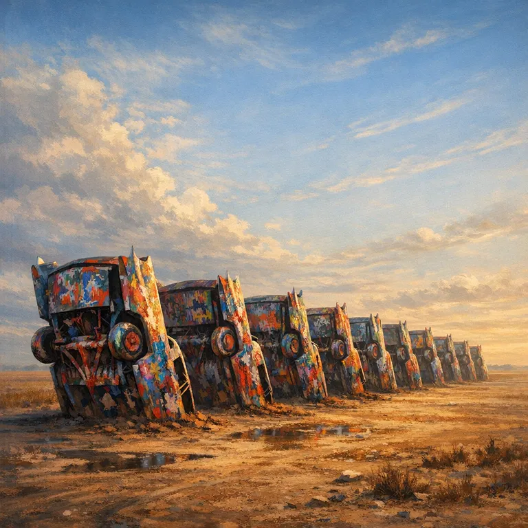 An iconic public art installation featuring a series of half-buried, graffiti-covered Cadillacs.