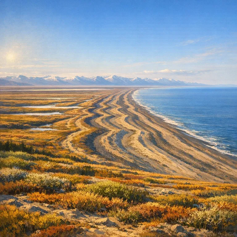 Arctic coastline with a series of beach ridges documenting 5,000 years of human habitation.