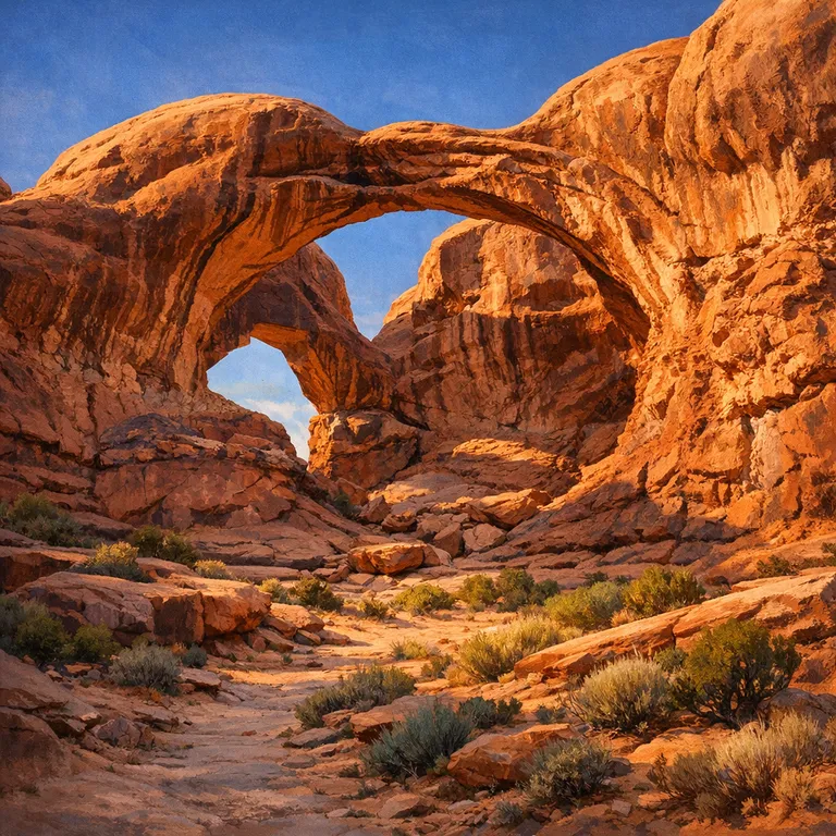 Double Arch is a spectacular formation consisting of two arches that share the same stone foundation. It is located near The Windows Section.