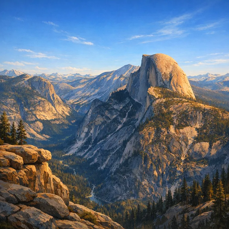An overlook with a commanding view of Yosemite Valley, Half Dome, and the High Sierra.