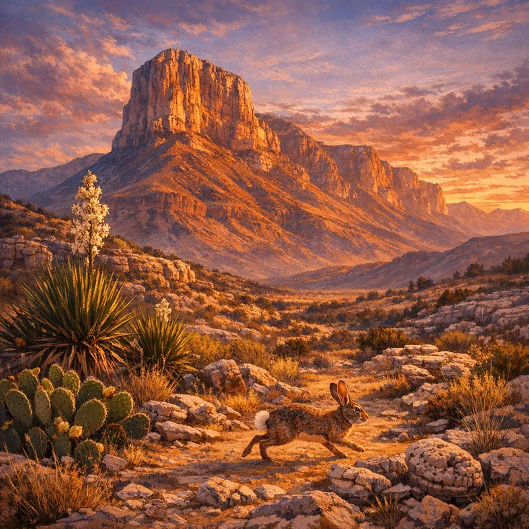 Features the highest peaks in Texas, fossilized reef mountains, and diverse desert flora and fauna.