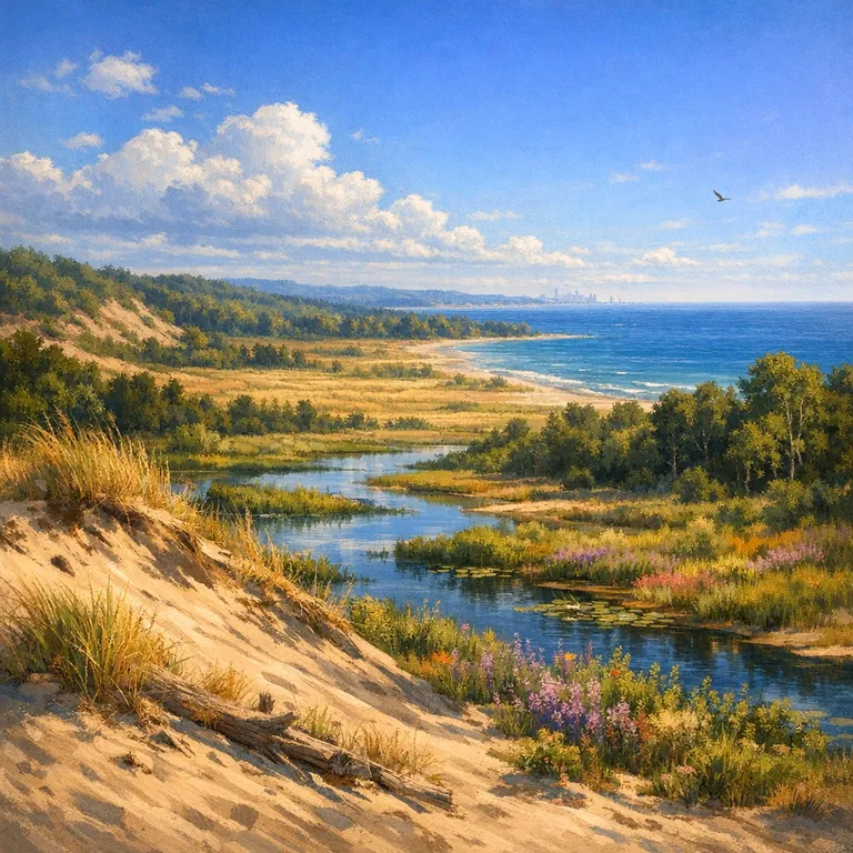 Diverse landscapes of dunes, wetlands, prairies, and forests along Lake Michigan's shoreline.