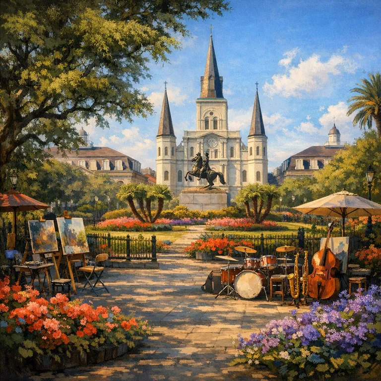 A historic park in the French Quarter, famous for its artists, musicians, and beautiful views of the St. Louis Cathedral.