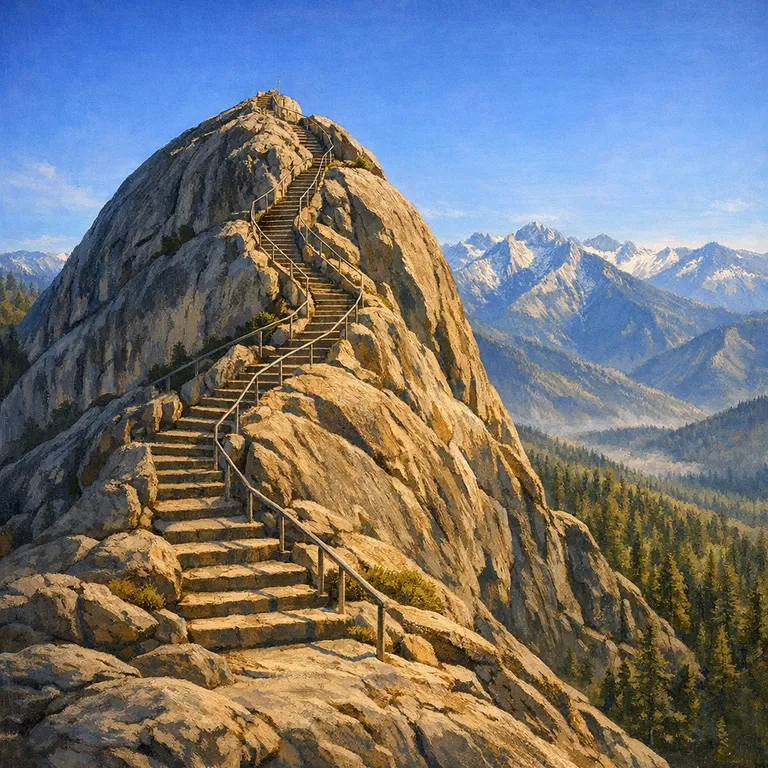 A granite dome offering a steep stairway with panoramic views of the park and the Great Western Divide.