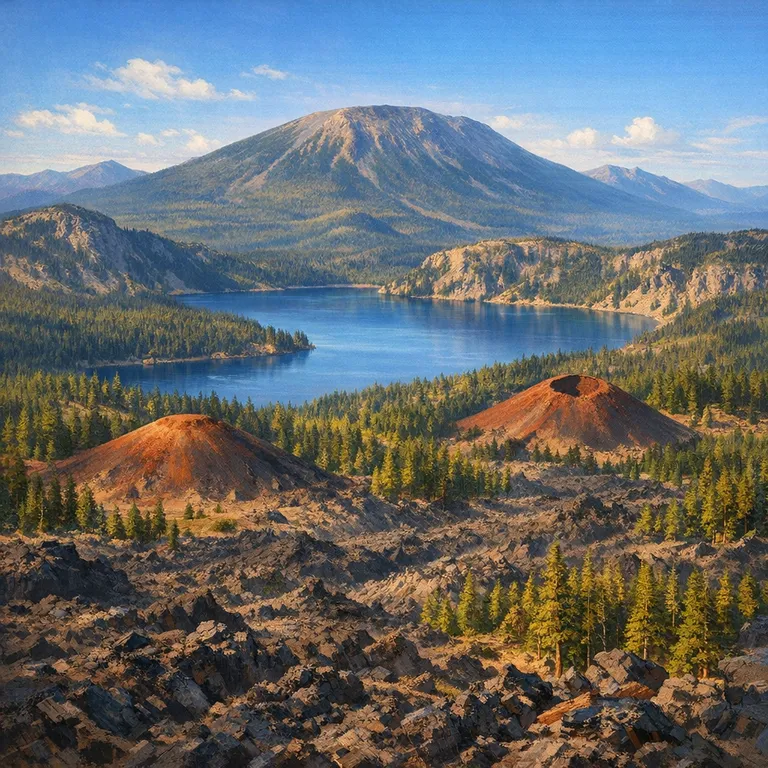 Features a massive shield volcano with lava flows, cinder cones, and the stunning Paulina Lakes.