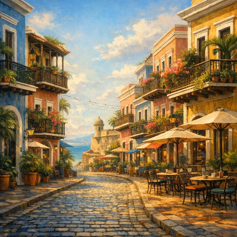 A historic district with colorful colonial buildings, shops, and restaurants, and cobblestone streets.