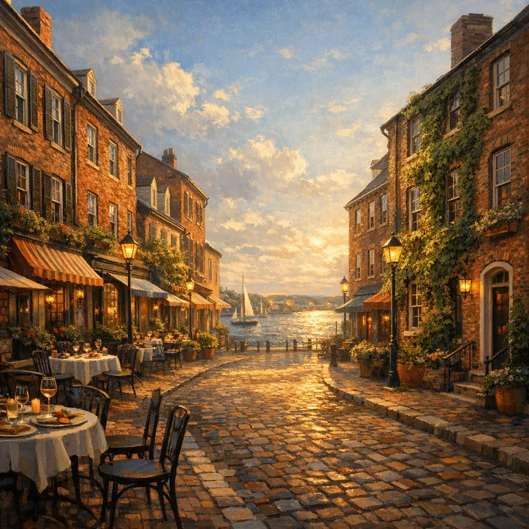 A historic district featuring cobblestone streets, 18th-century townhouses, waterfront views, and a bustling commercial area with shops and restaurants.