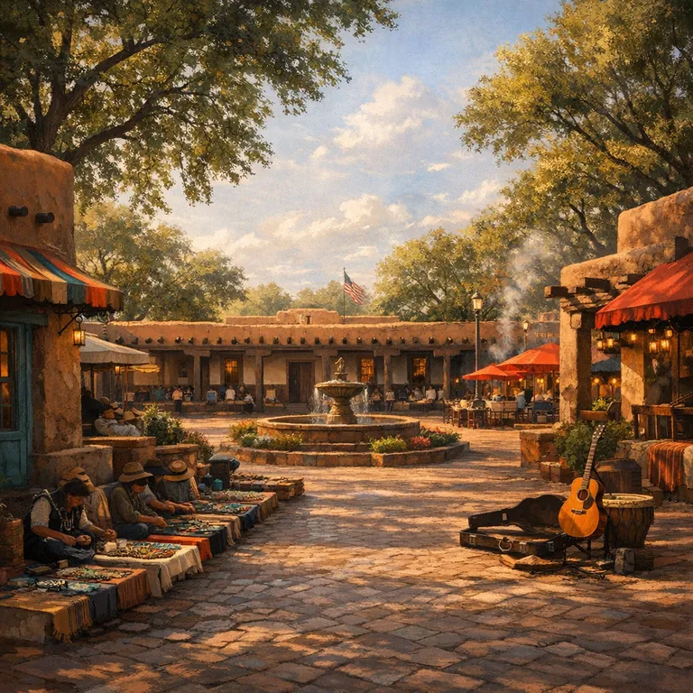 The historic center of Santa Fe, featuring shops, restaurants, and historic buildings, serving as the heartbeat of the city.