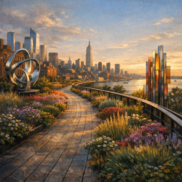 Elevated linear park built on a historic freight rail line, featuring gardens, art installations, and views of the Hudson River.