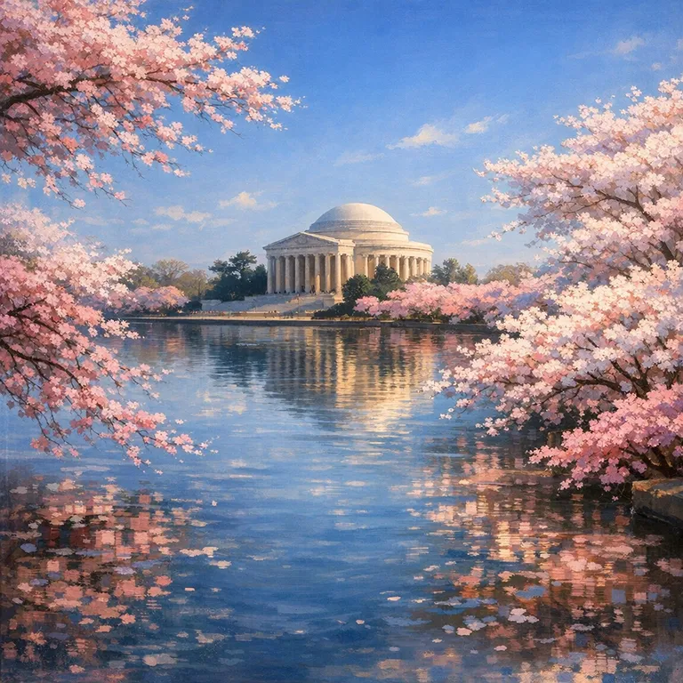 A picturesque reservoir surrounded by iconic cherry blossoms, especially popular in the spring.