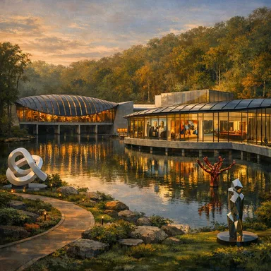 Surrounding woodland trails feature outdoor art installations integrated within the natural landscape.