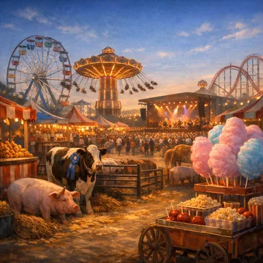 Deep-fried everything, carnival rides, livestock shows, and grandstand entertainment—this combo celebrates classic American fair culture. It's a tour of big fairs where local pride meets big crowds.