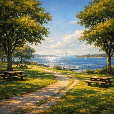 A large waterfront park offering picnic grounds, trails, and panoramic views of Narragansett Bay.