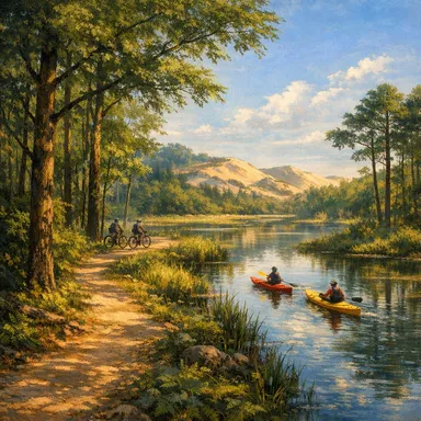 A historic state park offering hiking, biking, and kayaking activities with a scenic natural environment.