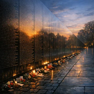 Somber black granite wall inscribed with the names of over 58,000 service members who died in the Vietnam War.