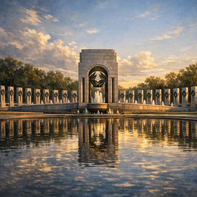 Honors the 16 million who served in the U.S. armed forces during World War II, featuring pillars and arches symbolizing unity.