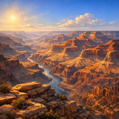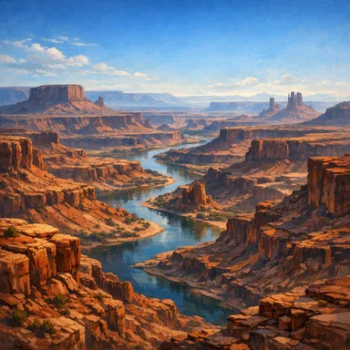 A vast desert landscape of canyons, mesas, and buttes carved by the Colorado River.