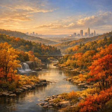 Offers rolling hills, forests, and the winding Cuyahoga River between Akron and Cleveland.