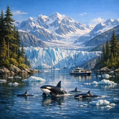 A marine park with massive glaciers, temperate rainforest, and diverse wildlife.