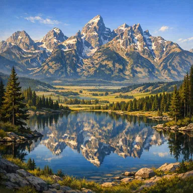Features the Teton Range's rugged peaks and the scenic valley of Jackson Hole.