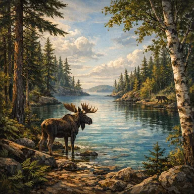 Remote island wilderness in Lake Superior, known for its wolf and moose populations.