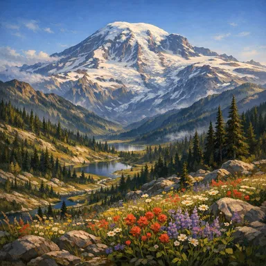 Dominated by the glacier-capped Mount Rainier and surrounding valleys.