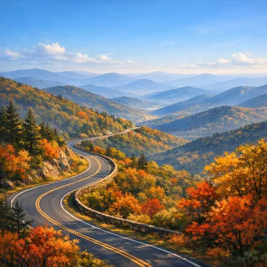 Features the scenic Skyline Drive and rolling Appalachian mountains.
