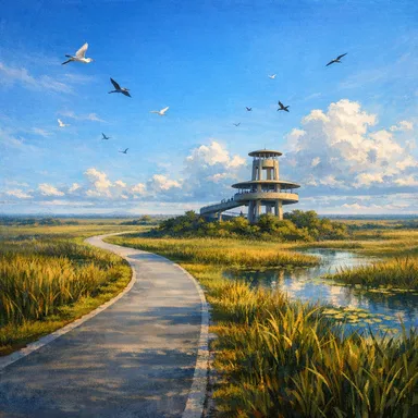 Features a 15-mile loop trail that can be explored by foot, bike, or tram tour, with the highlight being a climbable observation tower offering panoramic views of the Everglades.