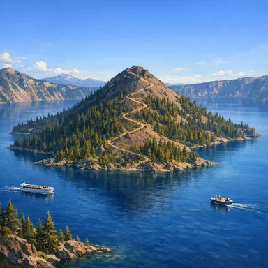 A volcanic cinder cone that rises above the surface of Crater Lake, popular for boat tours and hiking to the summit.