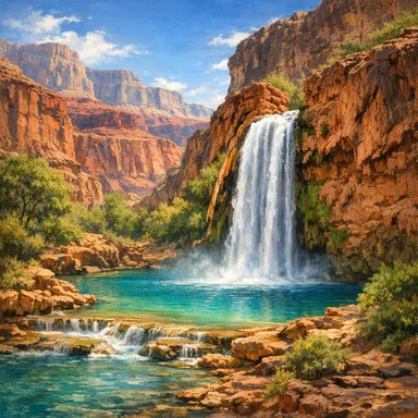 Famous for its turquoise blue waters, Havasu Falls is a spectacular waterfall located in a remote area of the Havasupai Indian Reservation within the Grand Canyon.