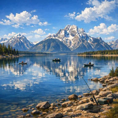 A large glacial lake offering recreational activities such as boating, fishing, and scenic cruises, with the backdrop of the Teton Range.