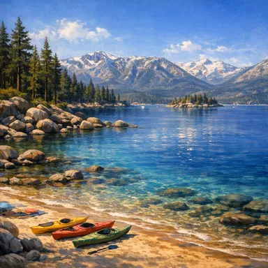 A large freshwater lake in the Sierra Nevada Mountains, known for its beaches and ski resorts.
