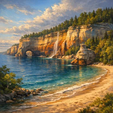 Features colorful sandstone cliffs, beautiful beaches, and forested trails along Lake Superior.