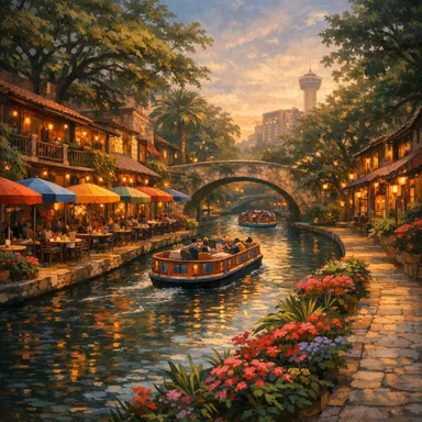 Scenic network of walkways along the San Antonio River, lined with restaurants and shops.