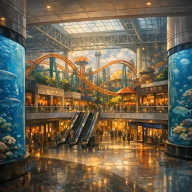 Enormous shopping and entertainment complex that features numerous stores, a theme park, and an aquarium.